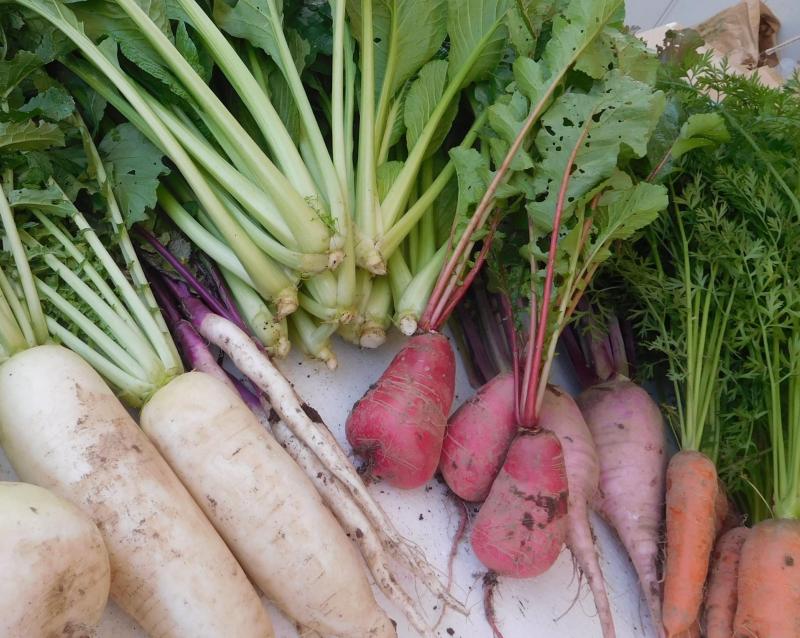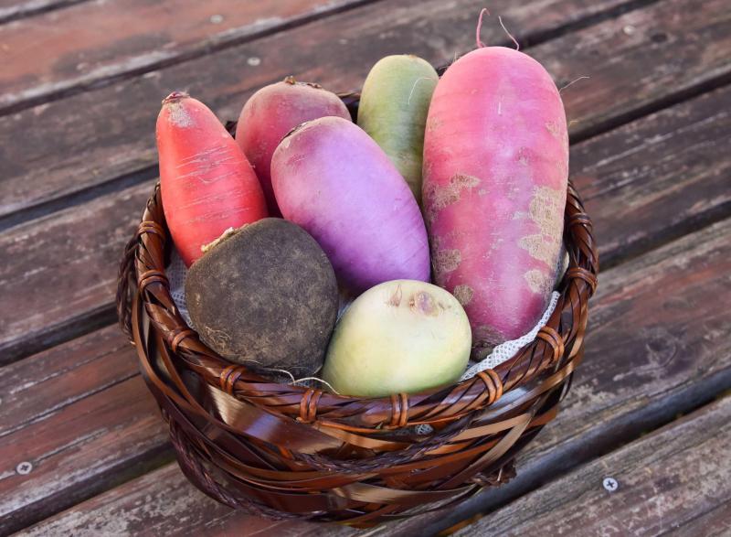 赤、緑、紫、黒など7種類のカラフルな大根です、通常の大きさとミニサイズの両方での出荷になります。生でサラダでグリルや蒸していただくと甘みが増しますし、スープなどで使うと、赤く染めます。辛いもの柔らかいもの様々ありますので、お好みによってお選びください。