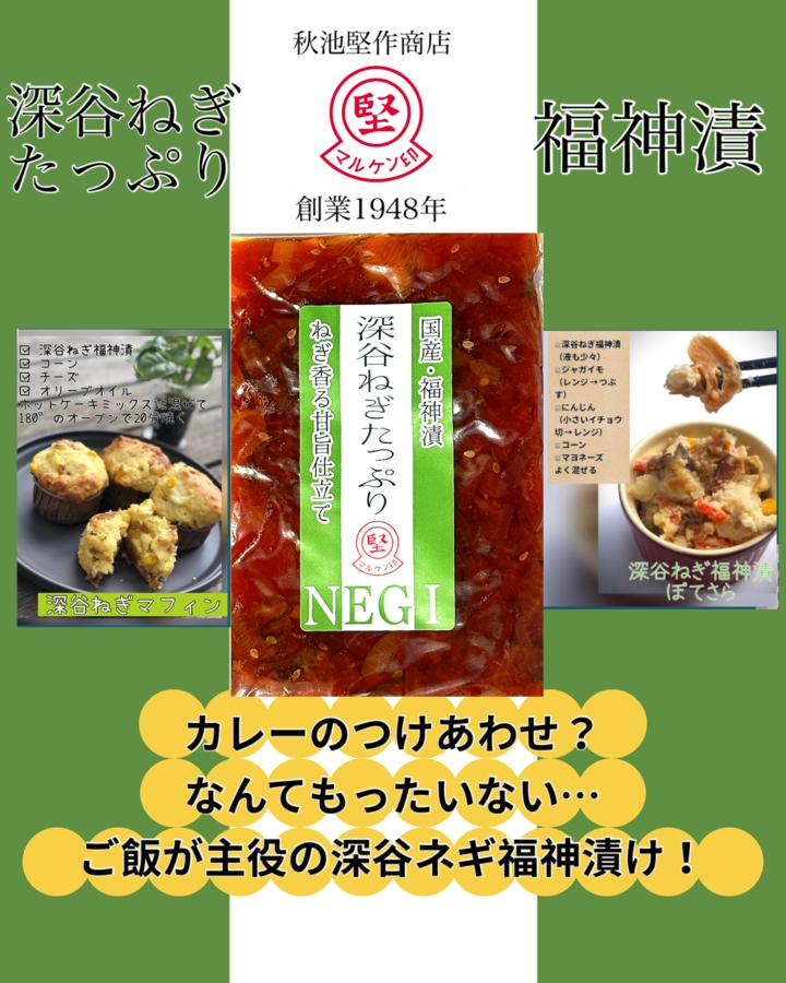 もともと弊社の人気商品だった福神漬に、試しに生の深谷ねぎを加えたところ、香りと甘みが見事に調和し、思わず「これは美味しい」と社内で評判に。その味を商品化したのが「深谷ねぎたっぷり福神漬」です。深谷市特産のねぎを贅沢に使用し、甘めの味付けに爽やかな風味が広がる後引く味わい。ご飯との相性は抜群で、カレーや丼物にもぴったり。素材の香りと旨味を引き立てた、深谷の魅力あふれる逸品です。