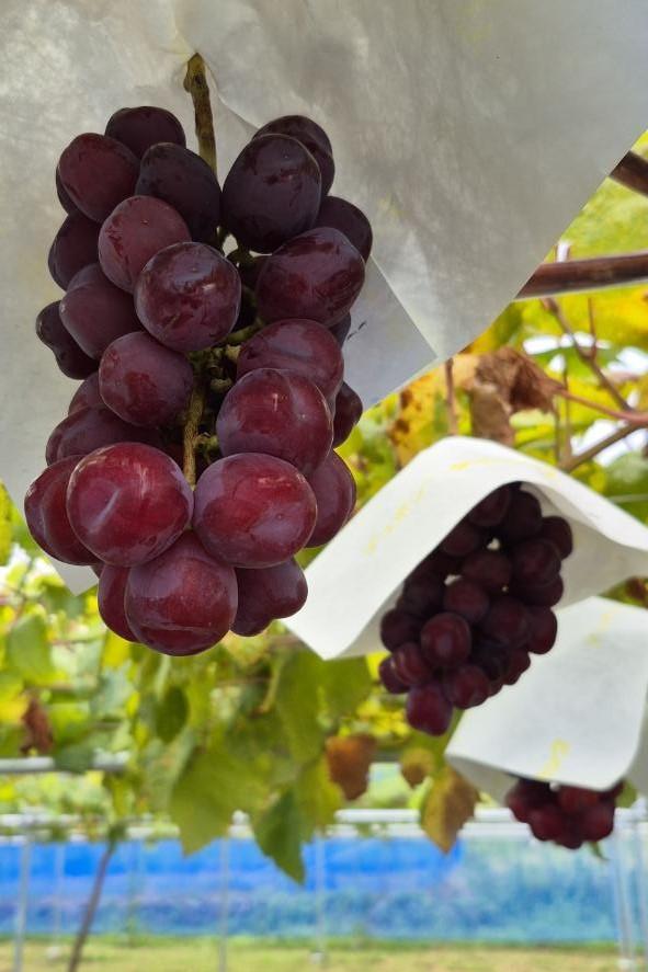 シャインマスカット・ブラックシャインマスカット・サンシャインレッド・ジュエルマスカット・BKシードレスを栽培中。長年ブドウ栽培を研究してきた専門家が、果樹栽培に適した環境のもと、品種がもつ個々のポテンシャルを最大限引き出す栽培方法により、品種本来の香りと深い旨味を備えた逸品を生産しています。